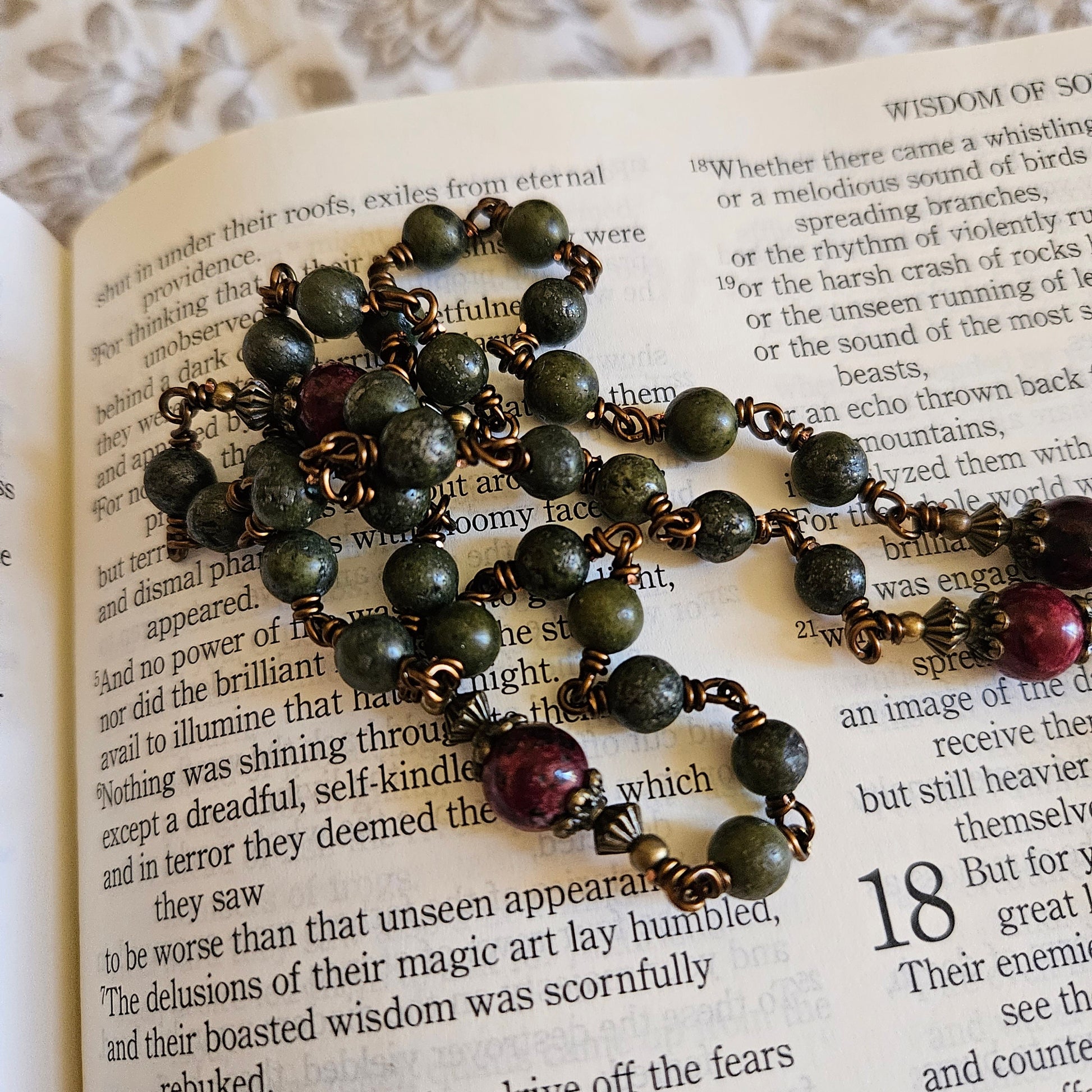 St. Anne Rosary – Handmade Catholic Rosary with Green Pyrite and Red Jade Beads