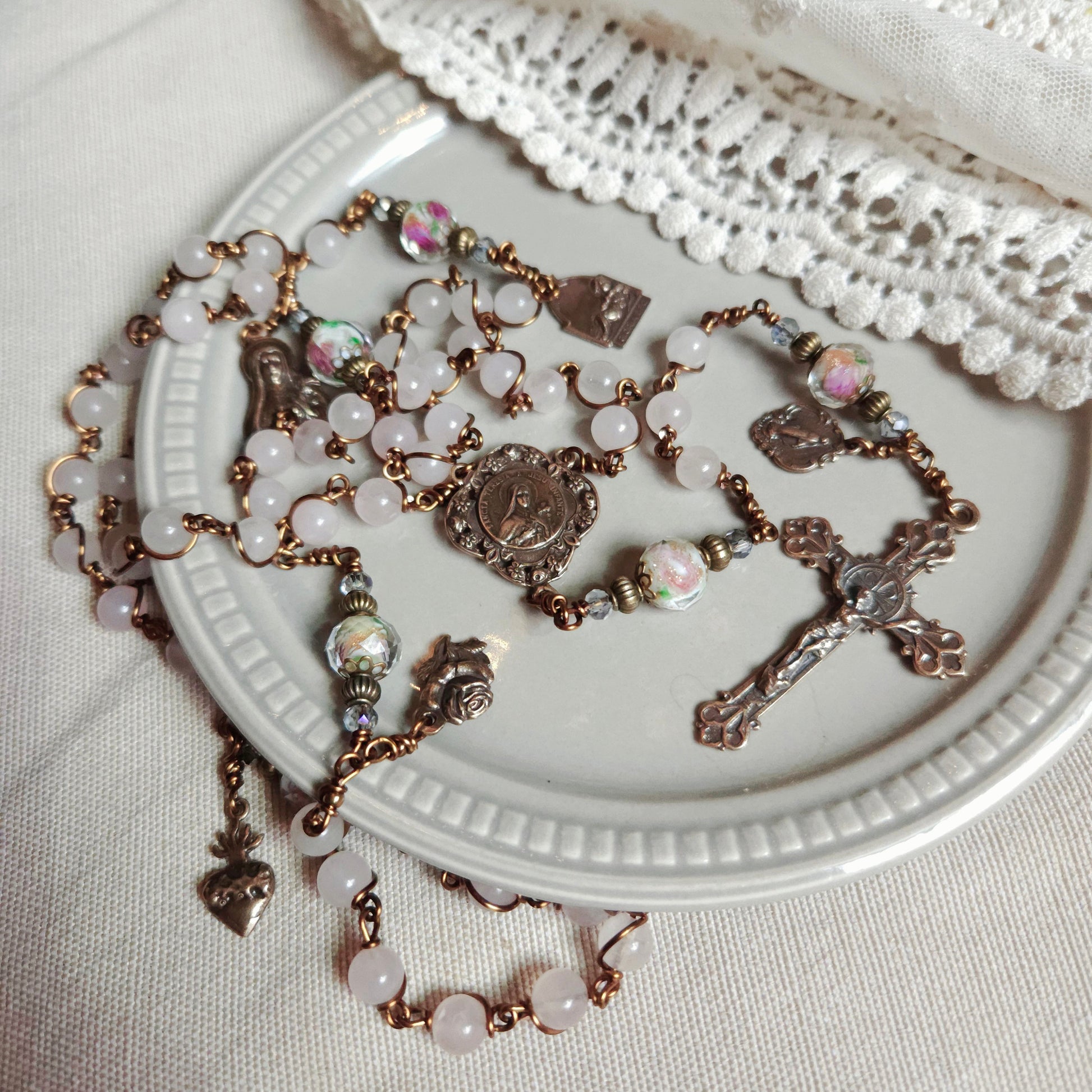 This handcrafted St. Therese Rosary is designed to offer sophisticated elegance and is made to last a lifetime. Each link is meticulously hand-wrapped to ensure durability, while the rose quartz Hail Mary beads and lampwork rose Our Father beads provide a beautiful, unique aesthetic. Featuring antique-replica medals and a bronze crucifix pendant, this rosary is a timeless piece that will become a treasured part of your Catholic devotion.